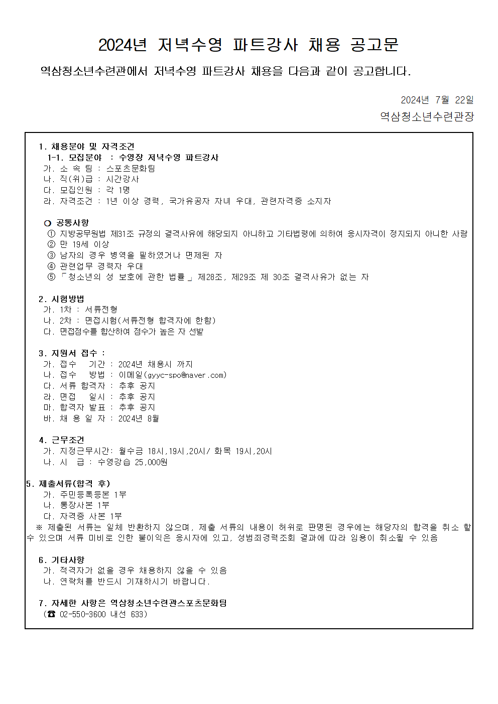 역삼청소년수련관 스포츠문화팀 교육문화 리듬체조 강사 채용 공고(완료)