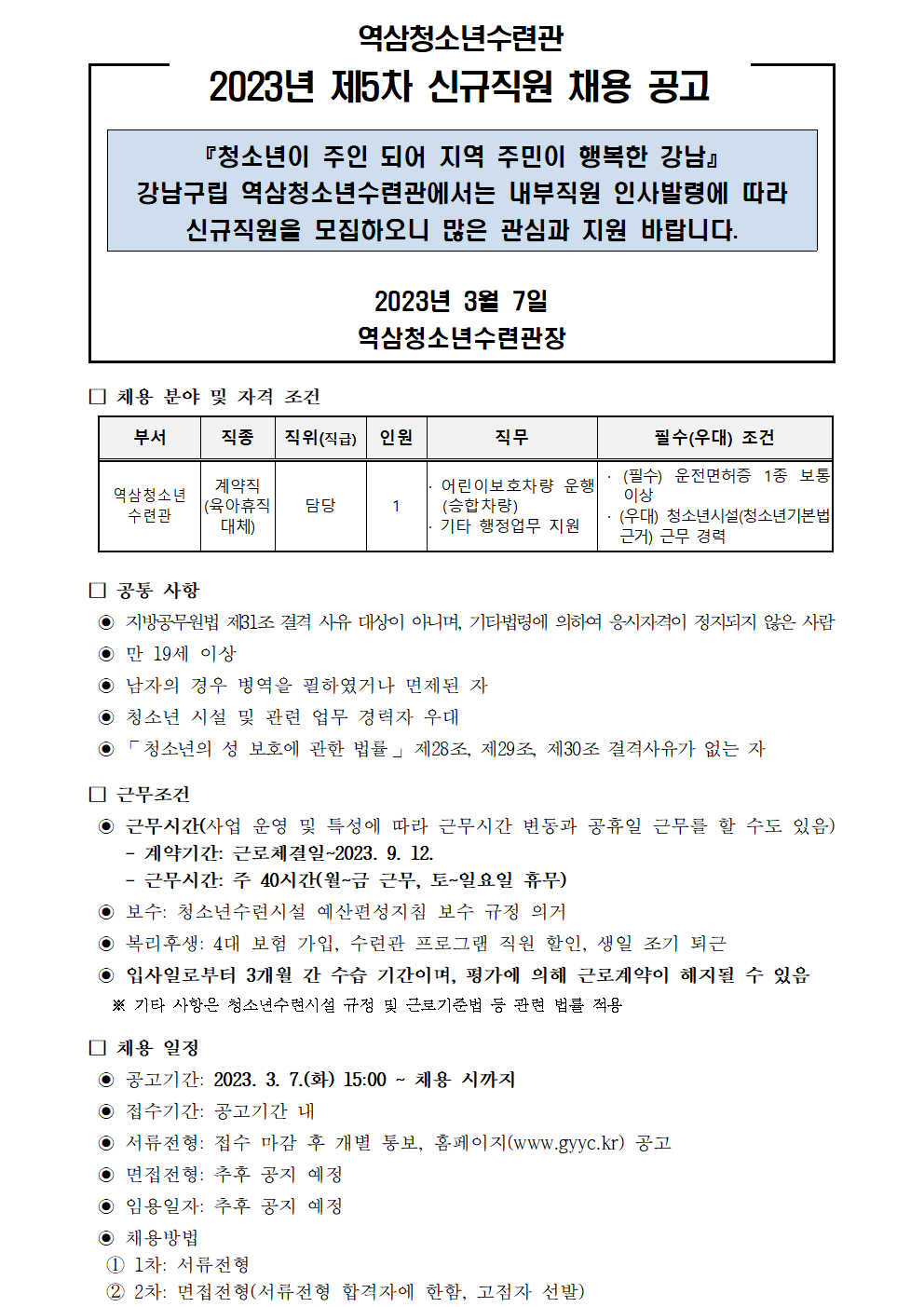 2023년도 제5차 역삼청소년수련관 신규 직원 채용 공고
