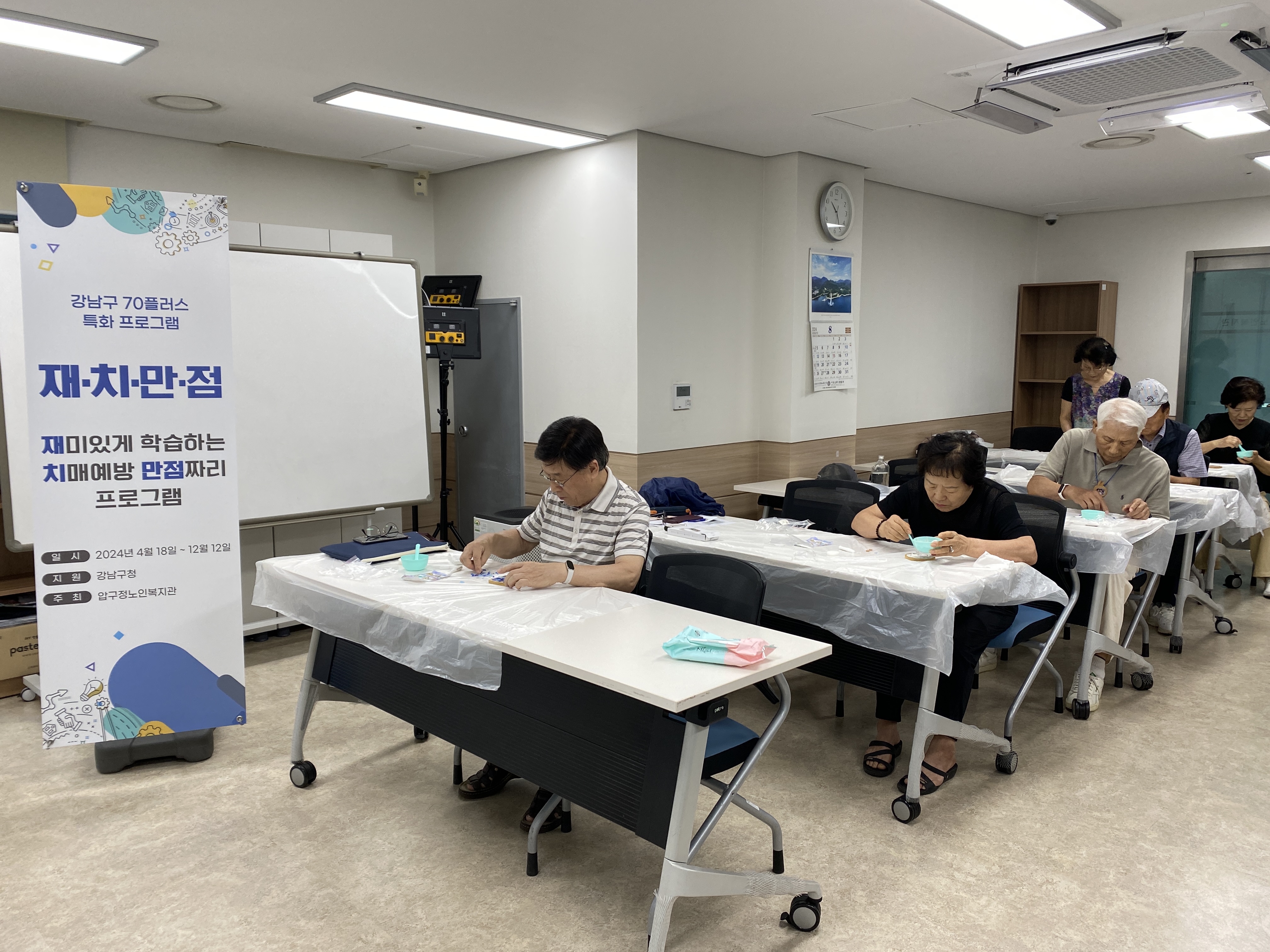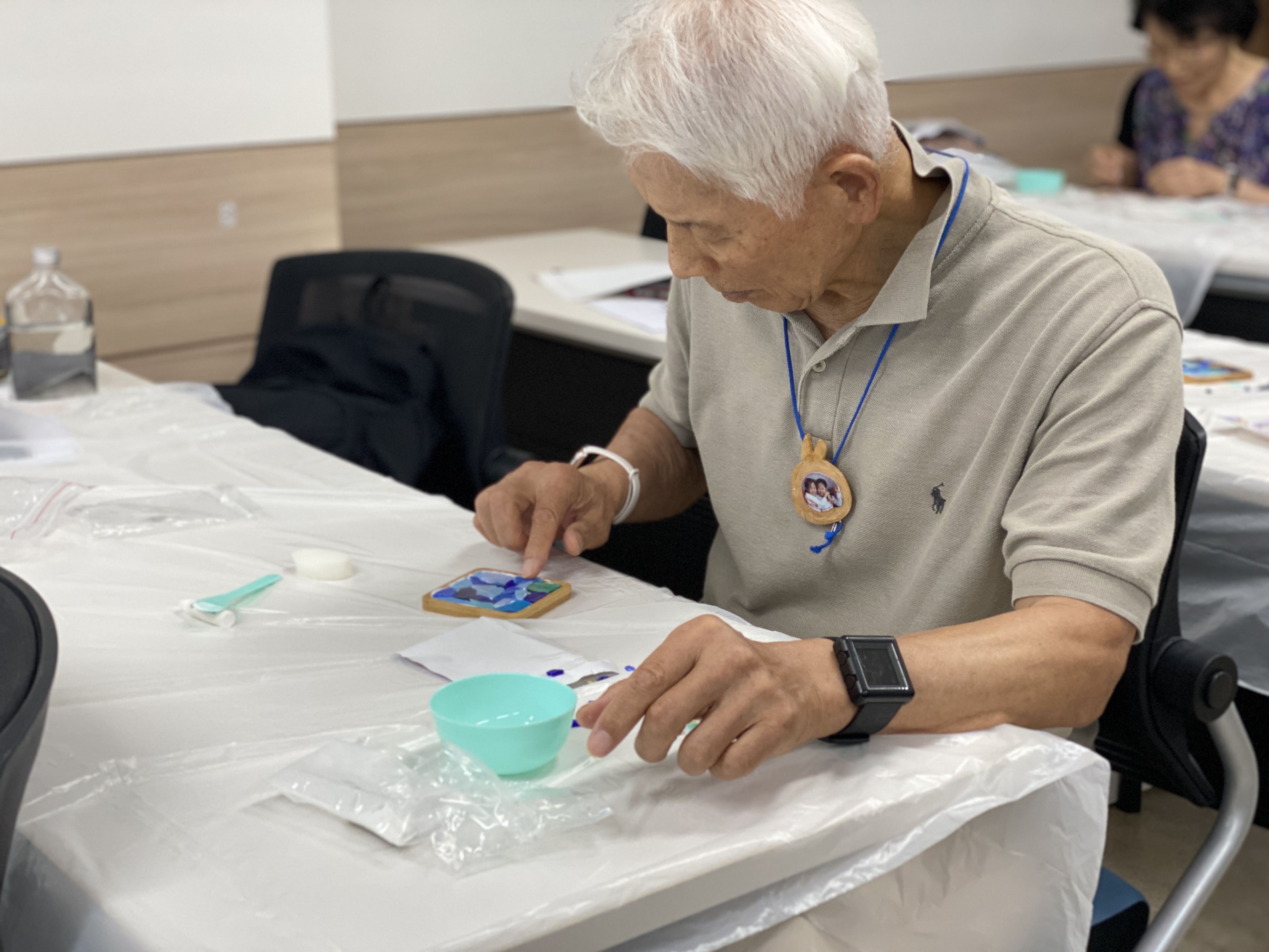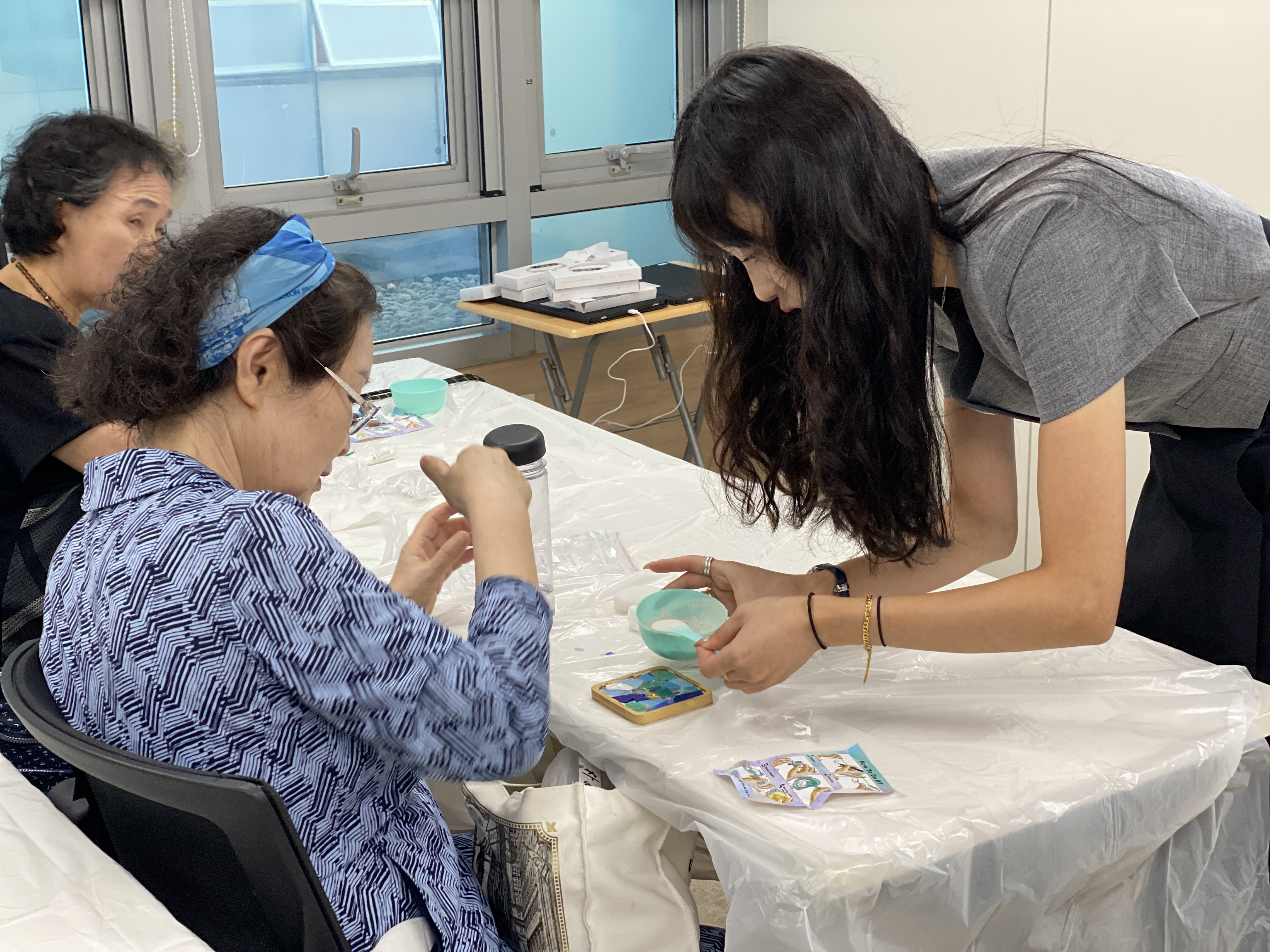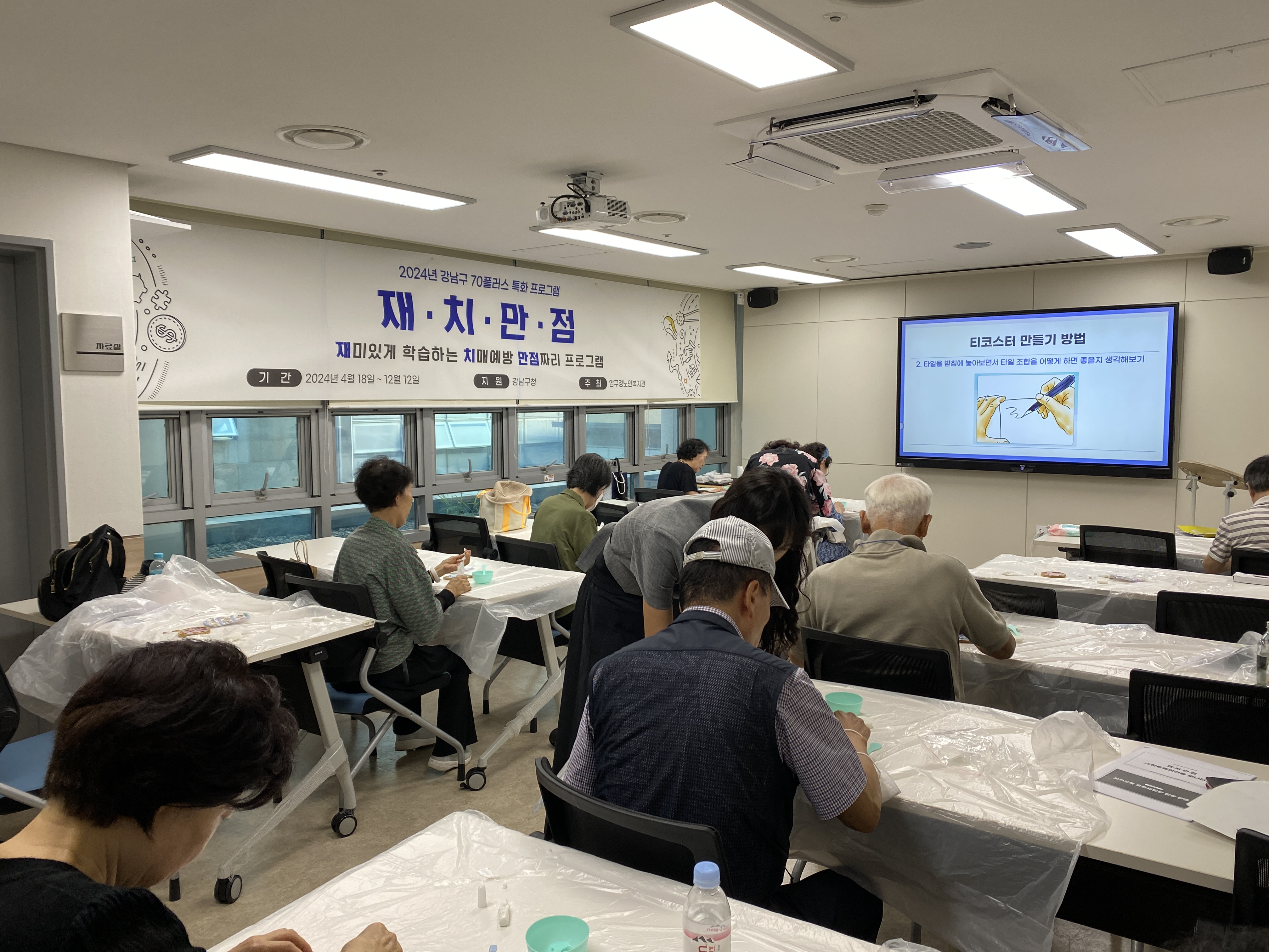 * 내 용: 어르신들의 신체 및 인지발달을 통한 치매예방을 위한 강남구 70플러스 특화사업 '재치만점' 치매예방 DIY키트 체험 클래스 첫번째 시간을 하반기 참여 어르신들과 함께 진행하였습니다. 첫번째 시간으로 티코스터 컵받침 만들기를 진행하였으며, 치매예방을 위한 소근육 활동의 중요성을 이해하는 시간을 가졌습니다. 각기 다르게 생긴 자개를 각각의 어르신들만의 스타일대로 조합하여 새로운 작품을 만들어보았습니다. 앞으로도 어르신들이 즐겁고 창의적으로 치매예방 DIY키트를 만들어 보는 시간이 되기를 기대합니다!