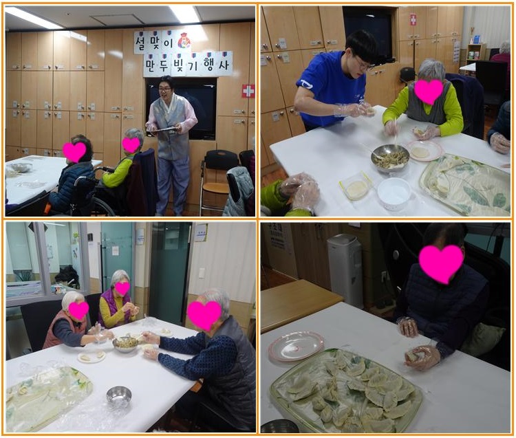 이용어르신, 직원 및 자원봉사자가 함께 어우러져 "만두빚기" 행사를 진행하였습니다.