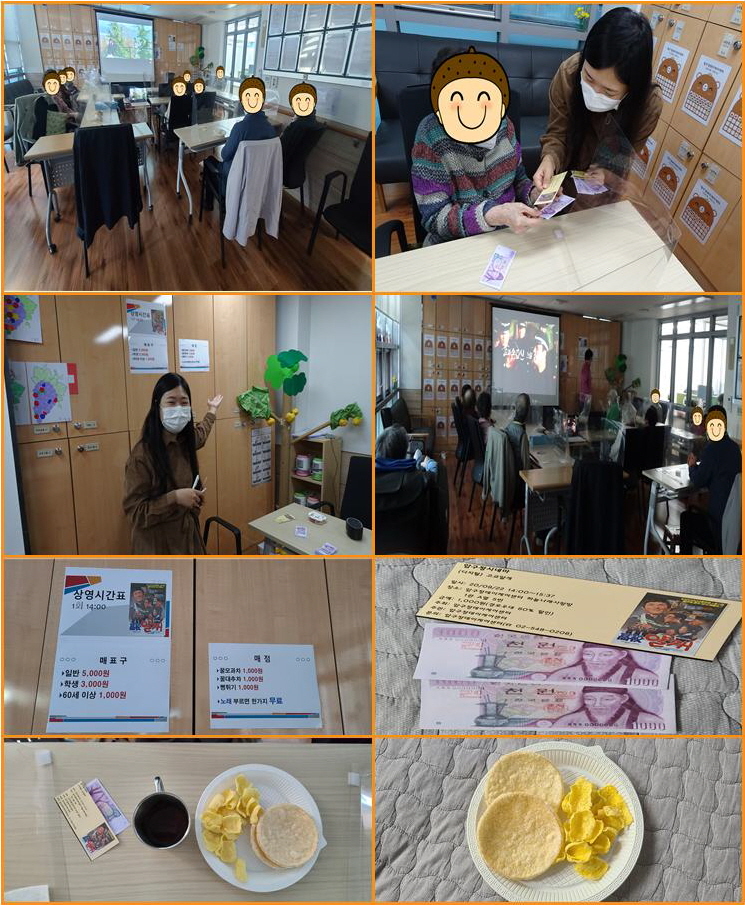 출석률에 따라 모은 모형지폐를 활용하여 영화티켓도 구입하고, 매점에서 과자와 차를 주문하기도 하며 여느 극장과 다름 없게 프로그램을 진행해보았습니다.