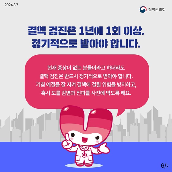 결핵 검진은 1년에 1회 이상, 정기적으로 받아야 합니다.