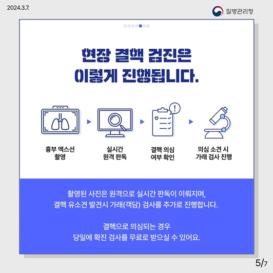 - 흉부 엑스선 촬영 → 실시간 원격 판독 → 결핵 의심 여부 확인 → 의심 소견 시 가래 검사 진행