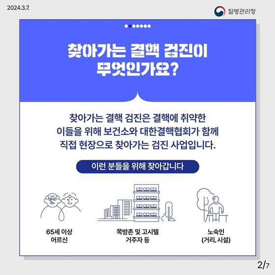 찾아가는 결핵 검진은 결핵에 취약한 이들을 위해 보건소와 대한결핵협회가 함께 직접 현장으로 찾아가는 검진 사업입니다.