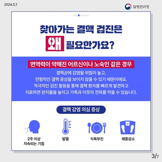 적극적인 검진 활동을 통해 결핵 환자를 빠르게 발견하고 치료하면 완치율을 높이고 가족과 이웃의 전파를 막을 수 있습니다.