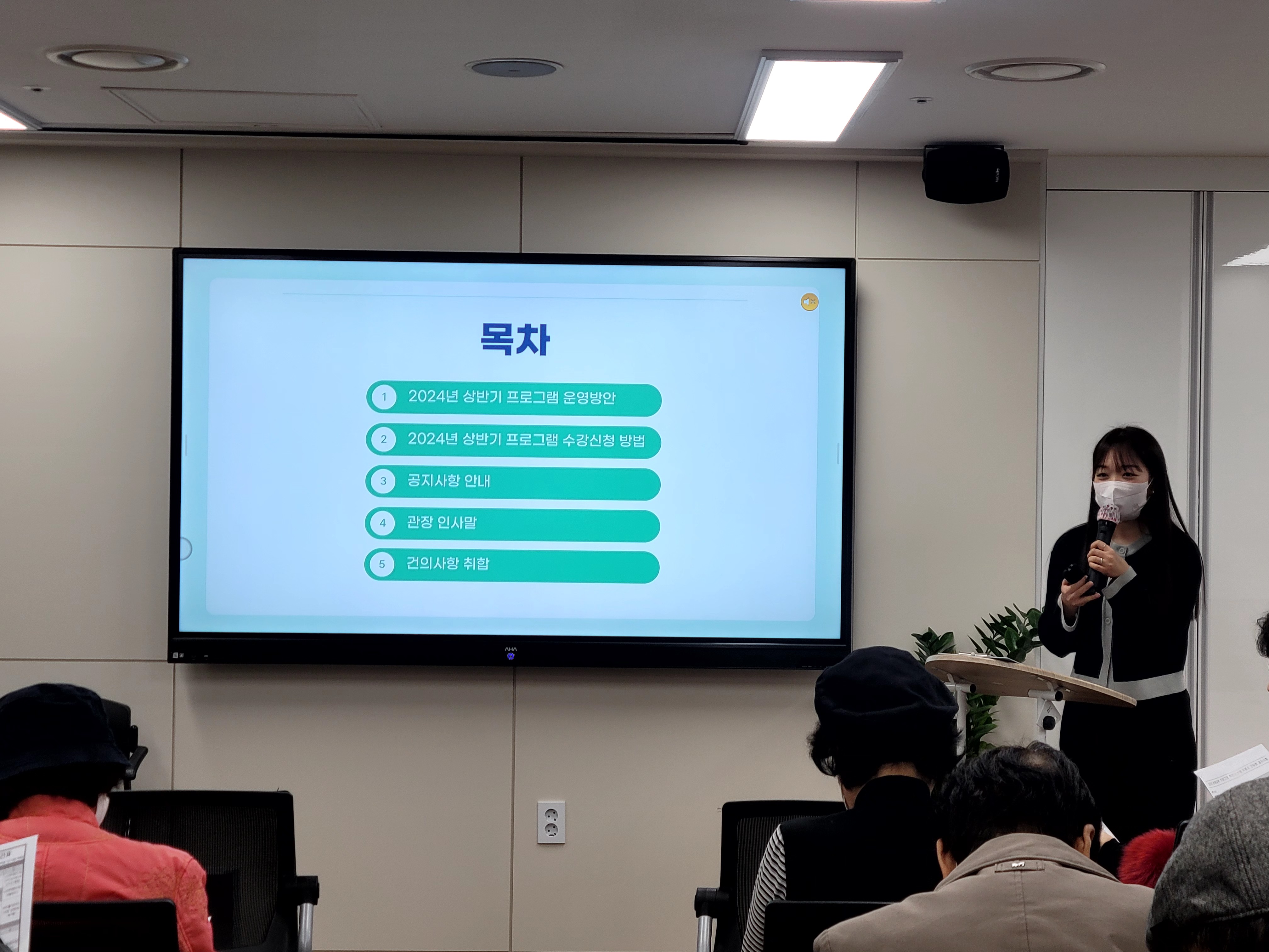 * 내용: 평생교육 프로그램 반장 어르신을 대상으로 하반기 간담회를 실시하였습니다. 2024년 상반기 운영방안과 공지사항 전달 후 사업 운영을 효과적으로 모색하기 위한 의견 및 건의사항을 청취하였습니다.
