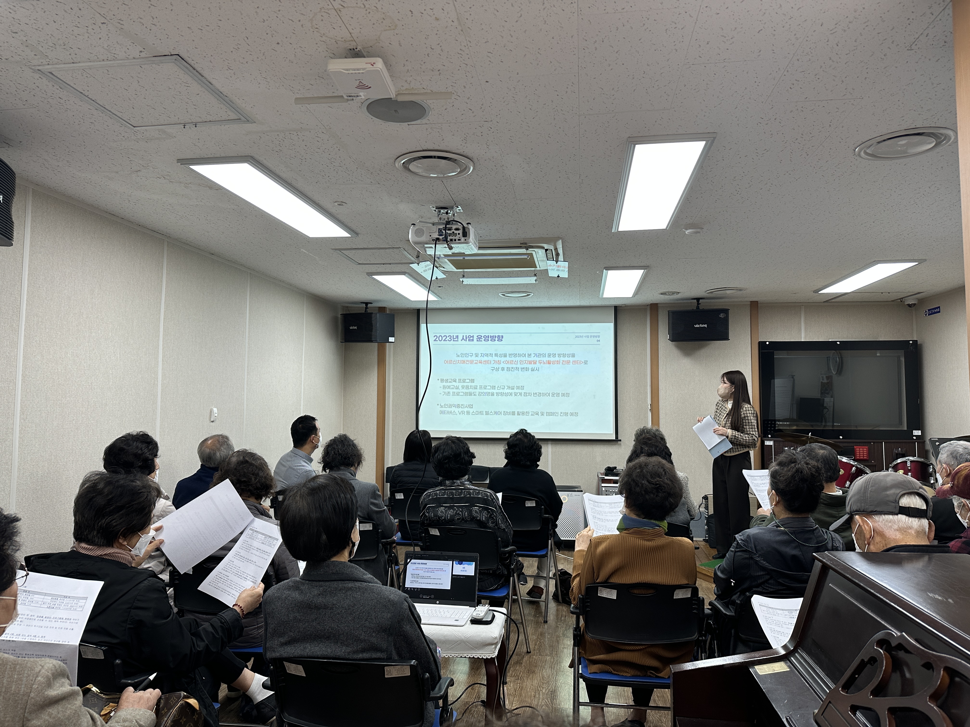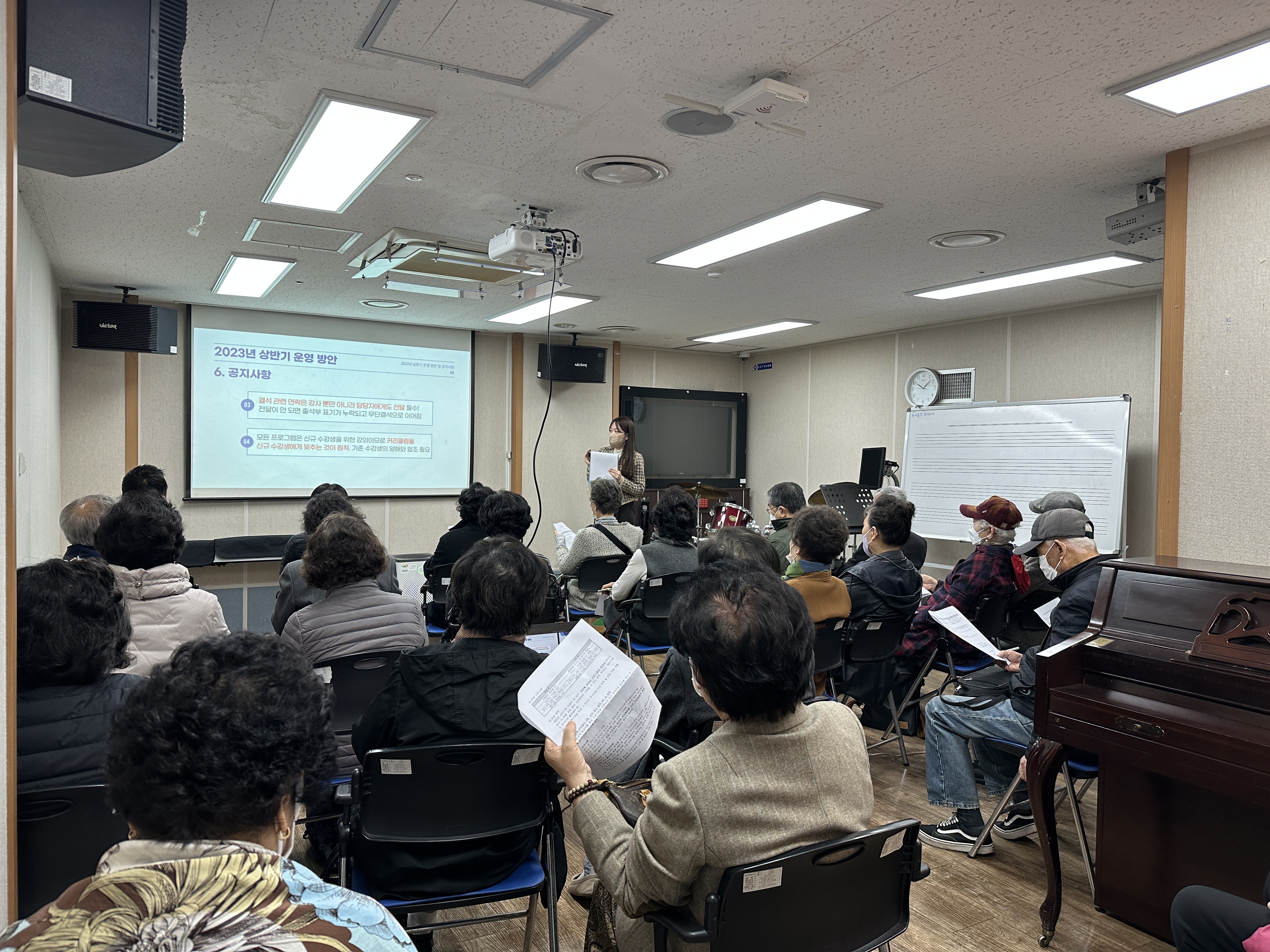 * 내 용: 평생교육 프로그램 각 강좌 반장을 대상으로 하반기 간담회를 실시하였습니다. 2023년 상반기 운영방안과 공지사항을 전달하고 이용 만족도 향상을 위해 욕구 및 의견을 수렴하는 시간을 가졌습니다. 또한 영화관람, 식사를 통해 반장 어르신들 간 정서적 교류할 수 있는 기회가 되었습니다.