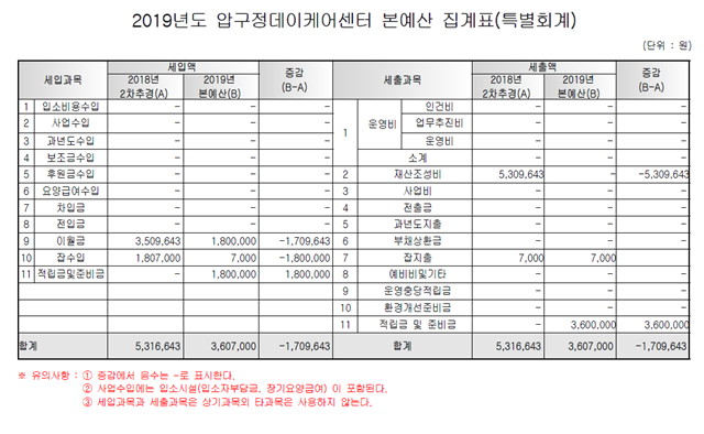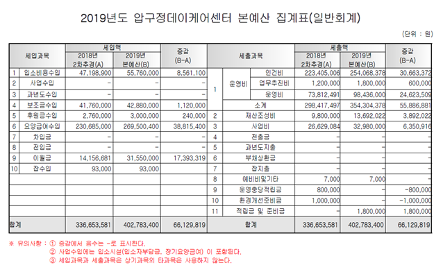(병설)압구정데이케어센터 2019년 본예산 공고