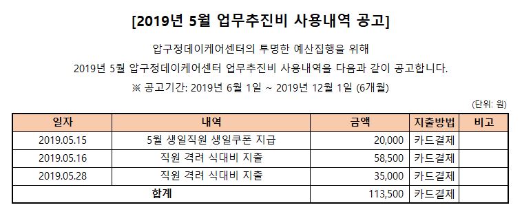 (병설)압구정데이케어센터 2019년 5월 업무추진비 게시