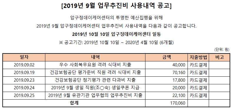 (병설)압구정데이케어센터 2019년 9월 업무추진비 사용내역