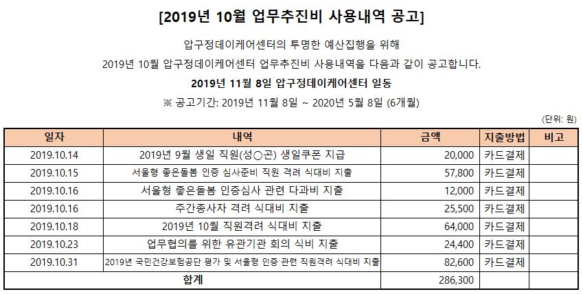 (병설)압구정데이케어센터 2019년 10월 업무추진비 사용내역