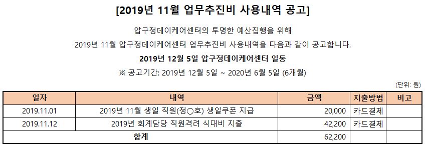 (병설)압구정데이케어센터 2019년 11월 업무추진비 사용내역