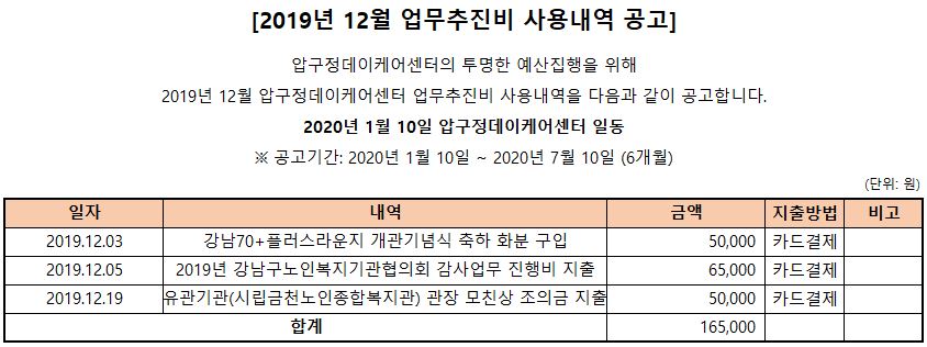 압구정노인복지센터 2019년 12월 업무추진비 사용내역
