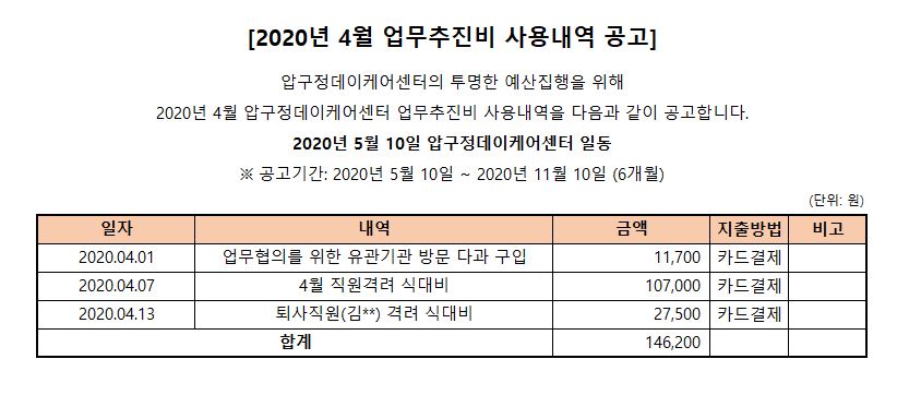 압구정노인복지센터 2020년 4월 업무추진비 사용내역