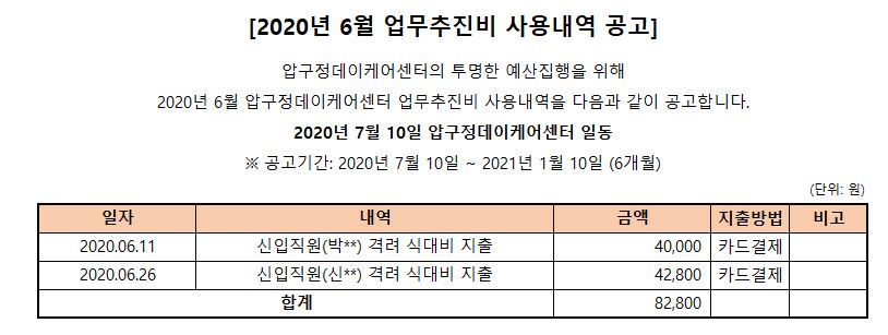 압구정노인복지센터 2020년 6월 업무추진비 사용내역
