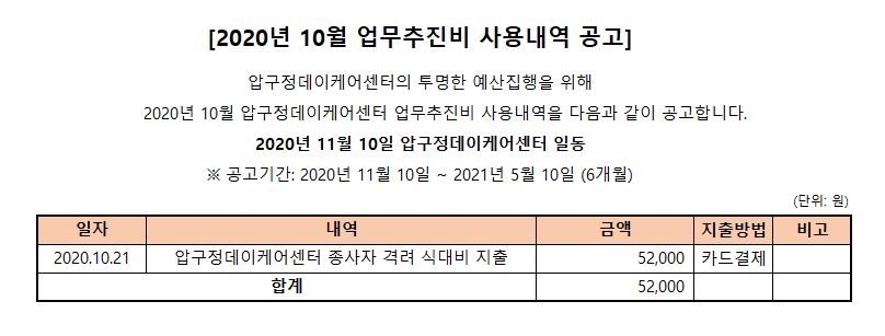 (병설)압구정데이케어센터 2020년 10월 업무추진비 사용내역
