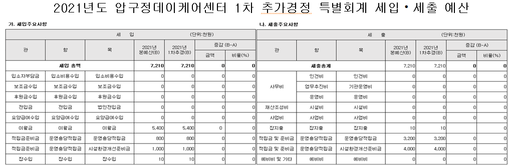 사회복지법인 재무회계규칙 제2장 제1절 제13조(추가경정예산)에 의거하여 압구정데이케어센터 2021년 1차 추가경정 특별회계 세입세출 예산을 아래와 같이 공고합니다.