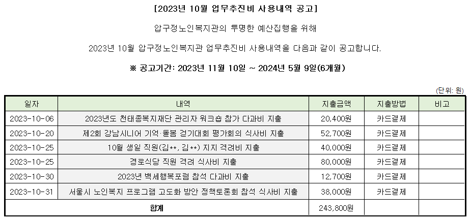 압구정노인복지관 2023년 10월 업무추진비 사용내역