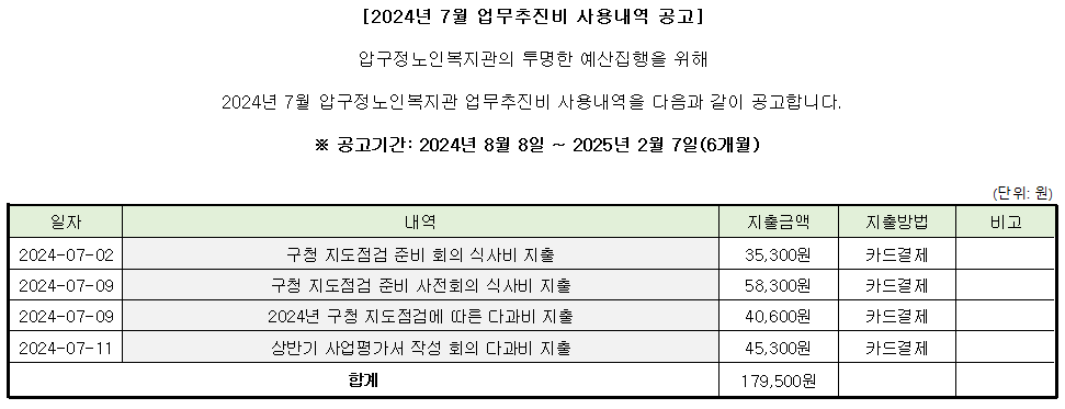 압구정노인복지관 2024년 7월 업무추진비 사용내역