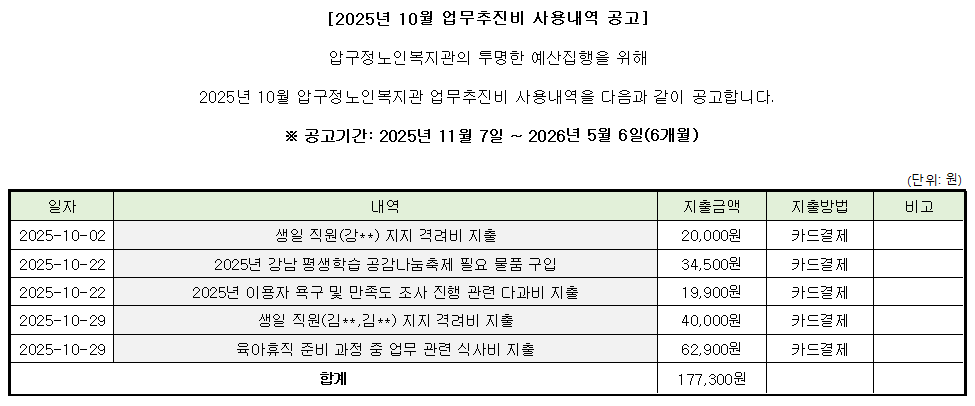 압구정노인복지관 2025년 10월 업무추진비 사용내역