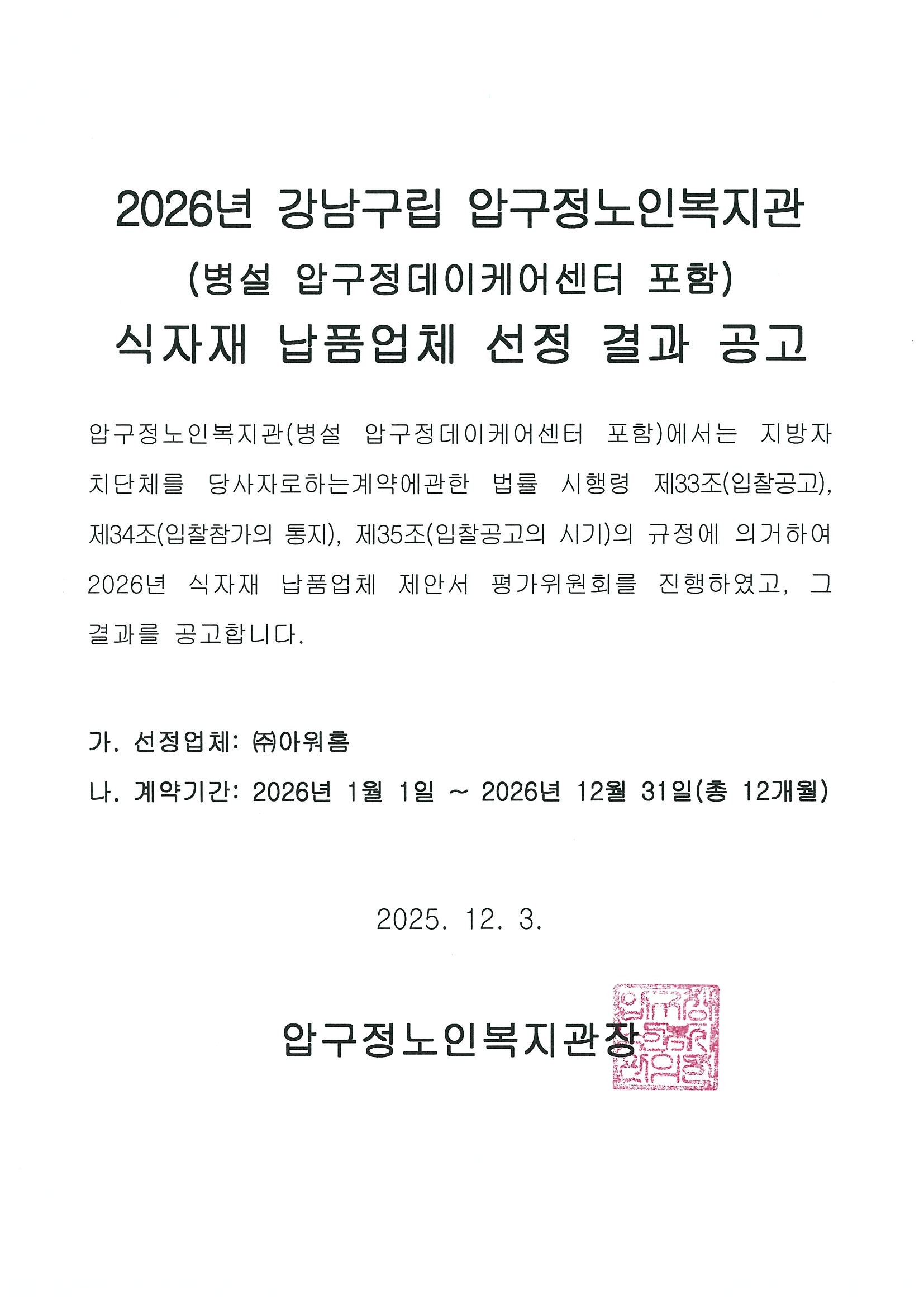 2026년 강남구립 압구정노인복지관(병설 압구정데이케어센터 포함) 식자재납품업체 선정 결과 공고