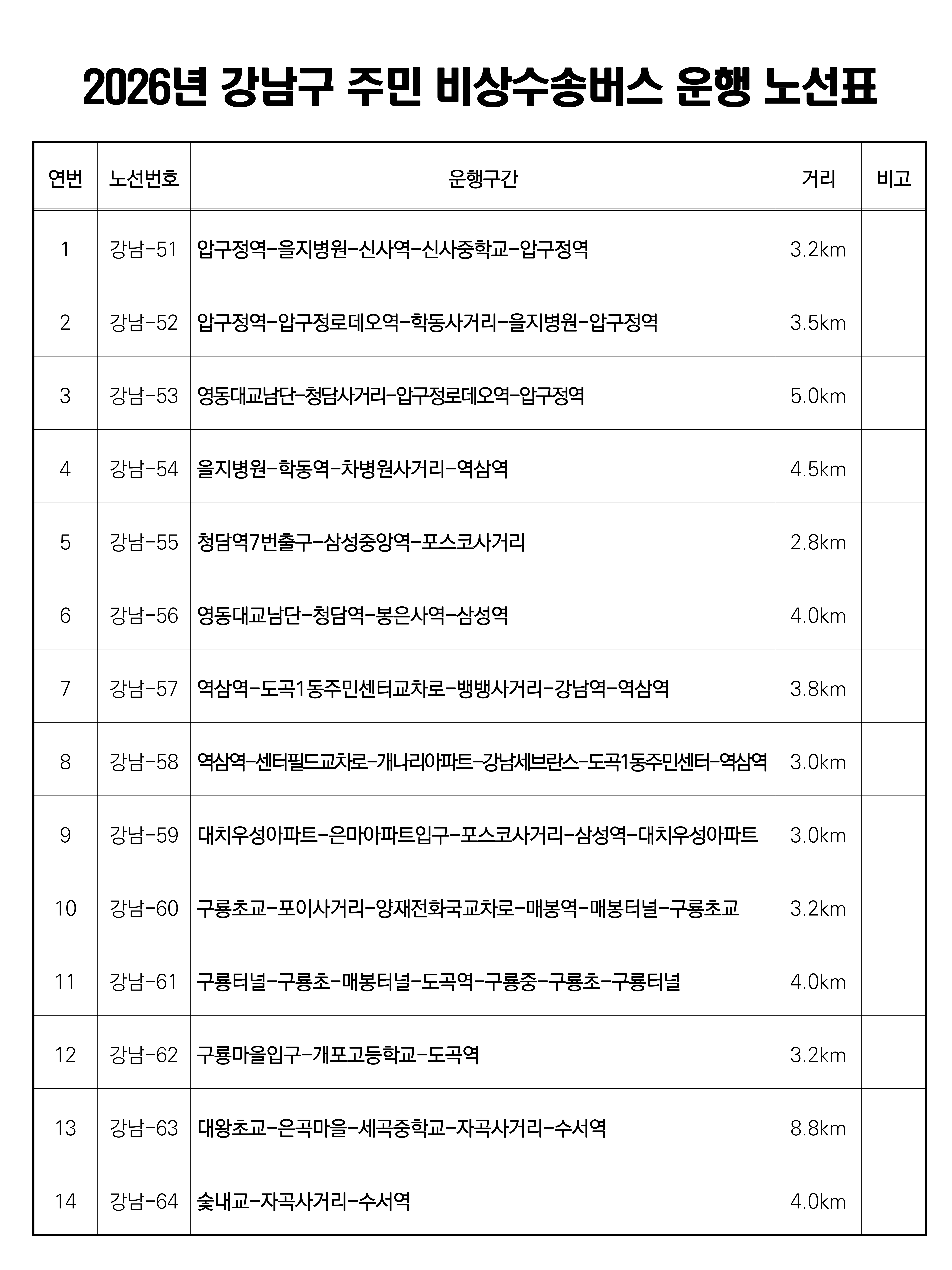 2026년 강남구 주민 비상수송버스 운행 노선표