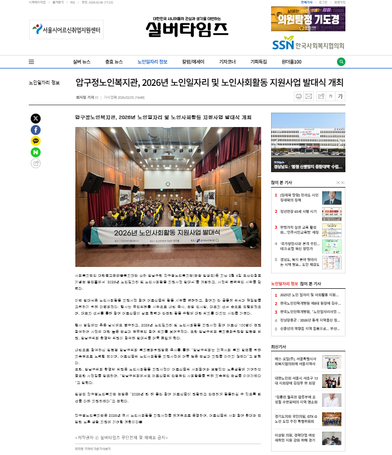 [실버타임즈] 압구정노인복지관, 2026년 노인일자리 및 노인사회활동 지원사업 발대식 개최
