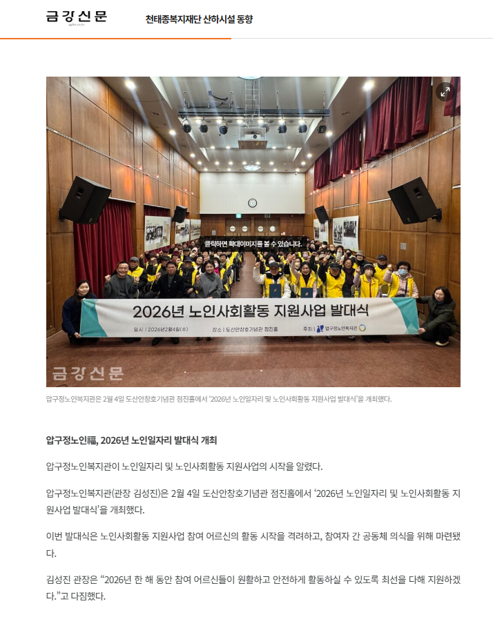 [금강신문] 압구정노인福, 2026년 노인일자리 발대식 개최