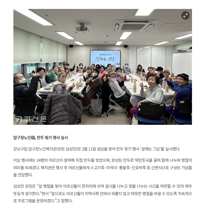 [금강신문] 압구정노인福, 만두 빚기 행사 실시