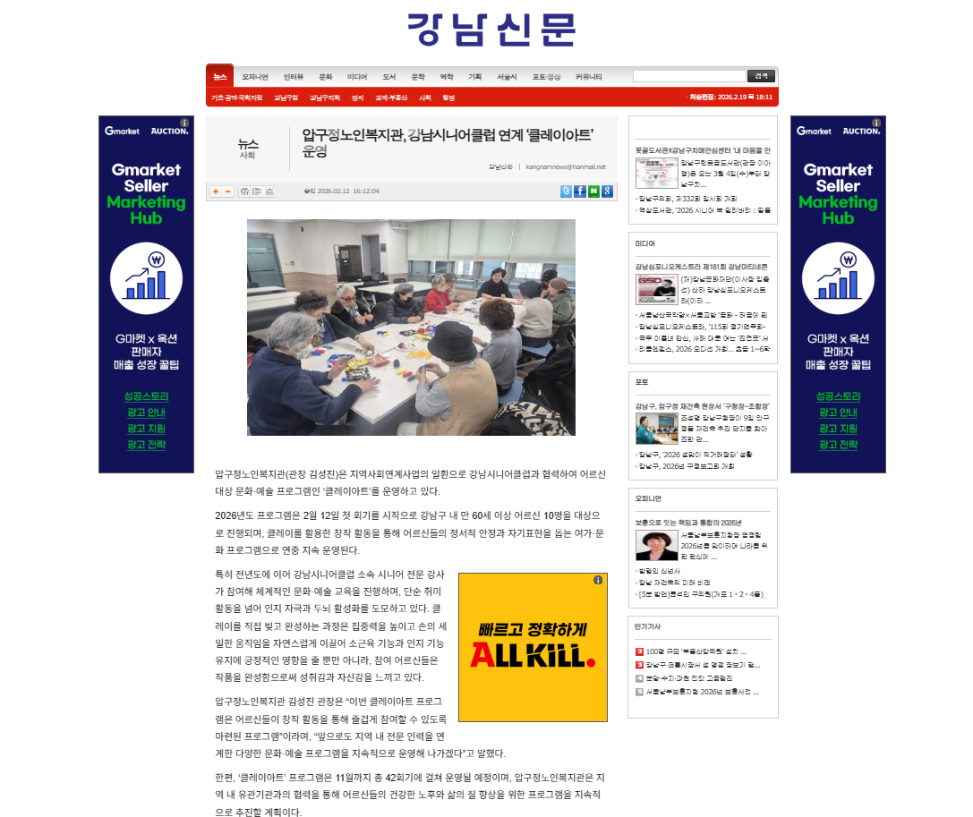 [강남신문] 압구정노인복지관, 강남시니어클럽 연계 ‘클레이아트’ 운영