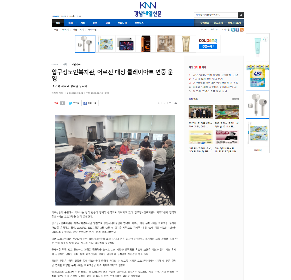[강남신문] 압구정노인복지관, 강남시니어클럽 연계 ‘클레이아트’ 운영