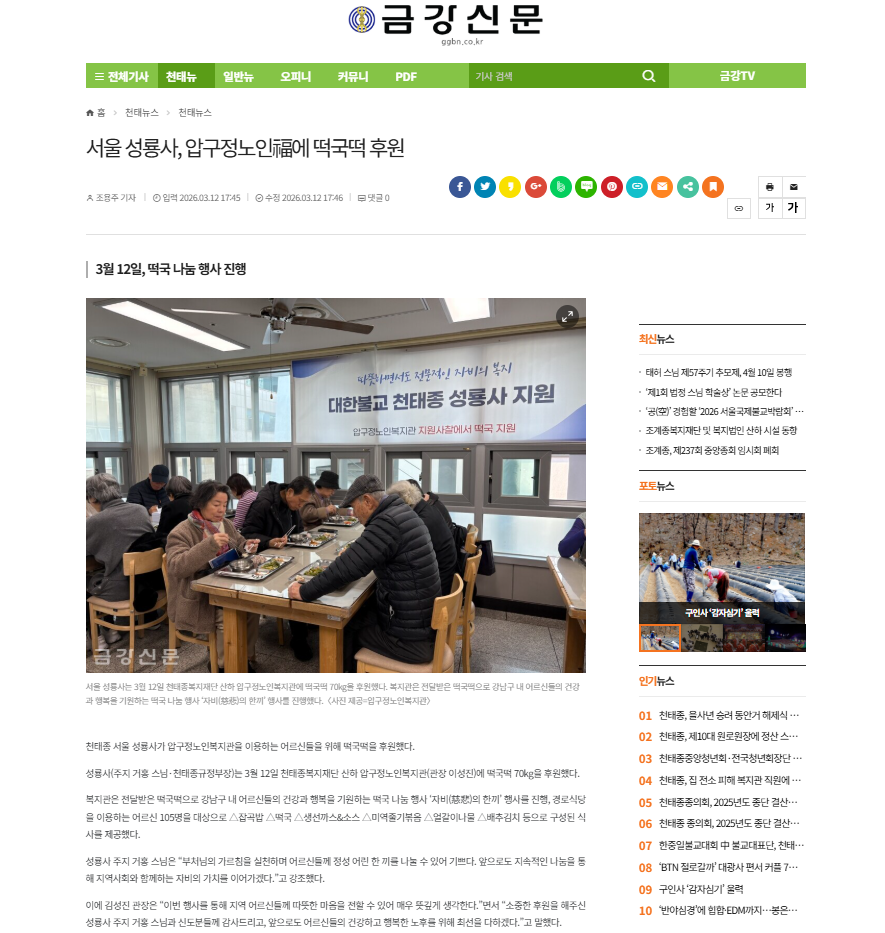 [금강신문] 서울 성룡사, 압구정노인福에 떡국떡 후원