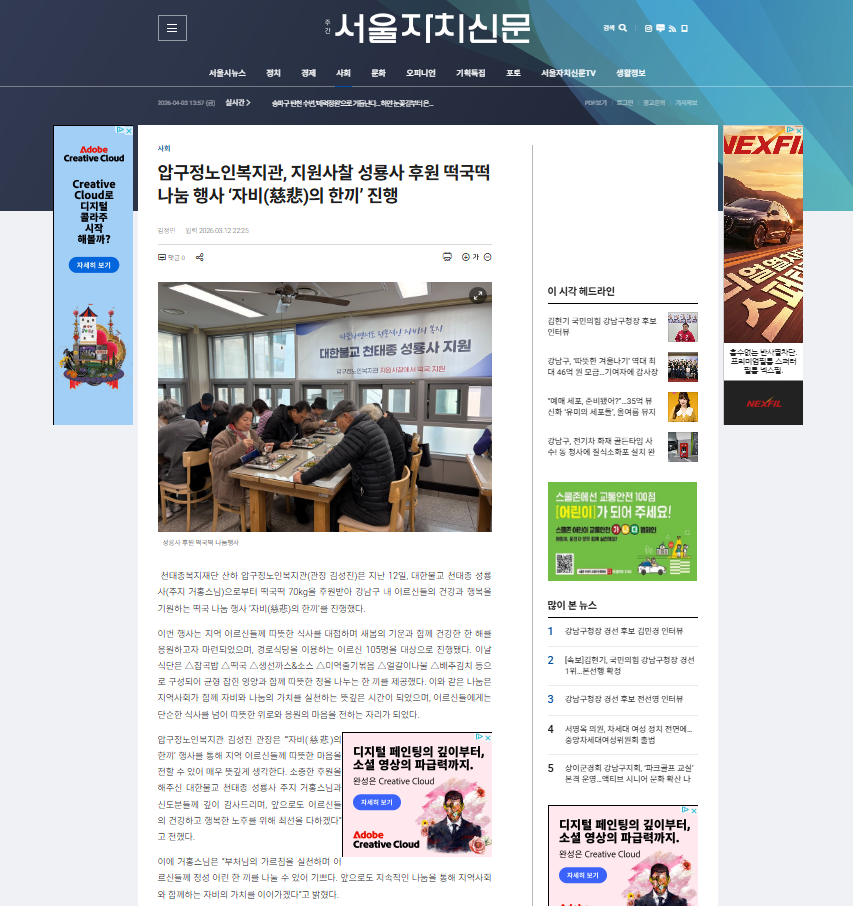 [서울자치신문] 압구정노인복지관, 지원사찰 성룡사 후원 떡국떡 나눔 행사 ‘자비(慈悲)의 한끼’ 진행