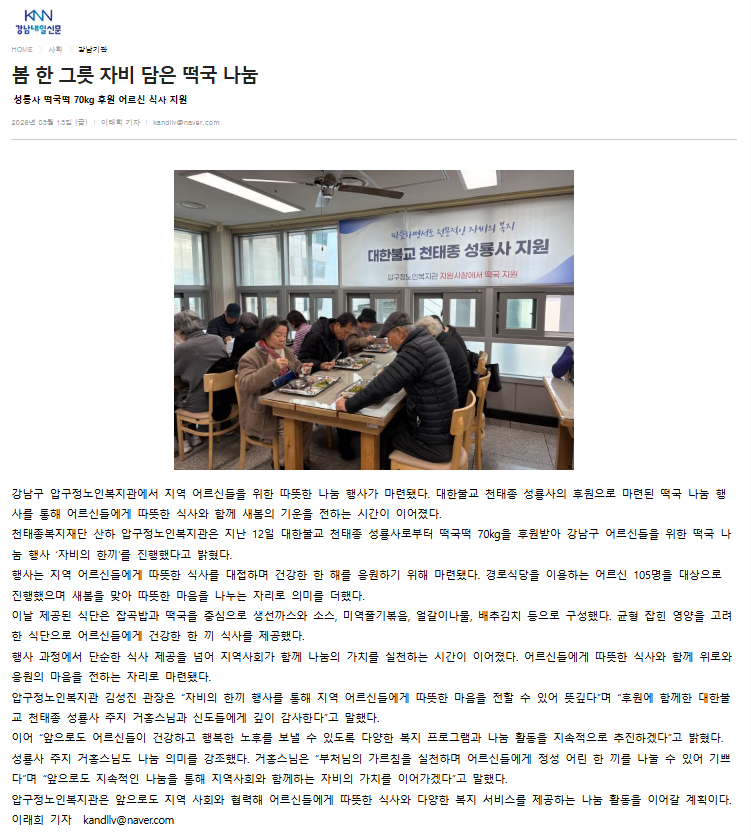 [강남내일신문] 봄 한 그릇 자비 담은 떡국 나눔 성룡사 떡국떡 70kg 후원 어르신 식사 지원