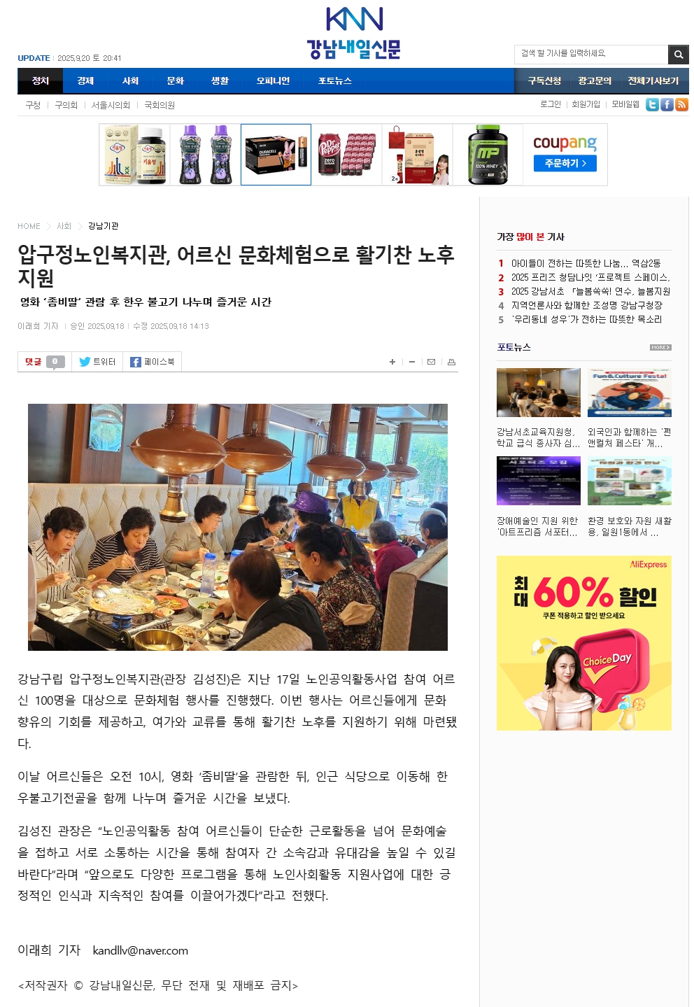 [강남내일신문] 압구정노인복지관, 어르신 문화체험으로 활기찬 노후 지원