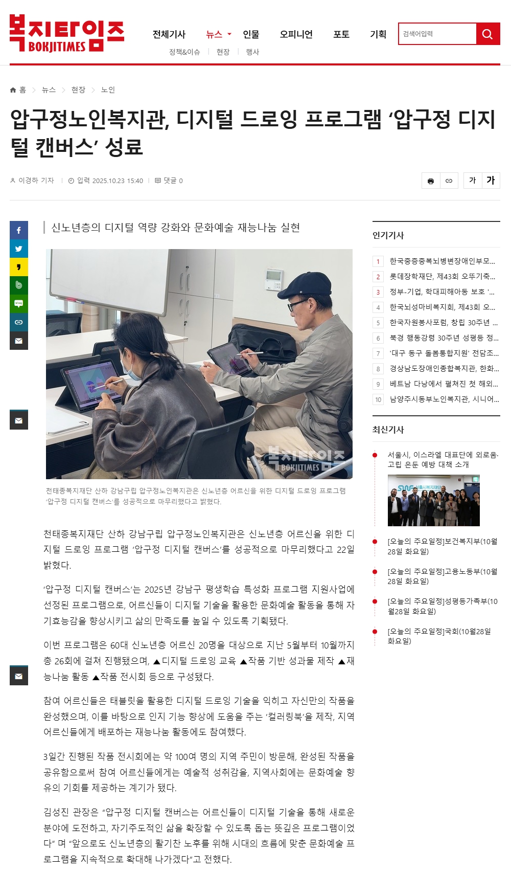 [복지타임즈] 압구정노인복지관, 디지털 드로잉 프로그램 ‘압구정 디지털 캔버스’ 성료