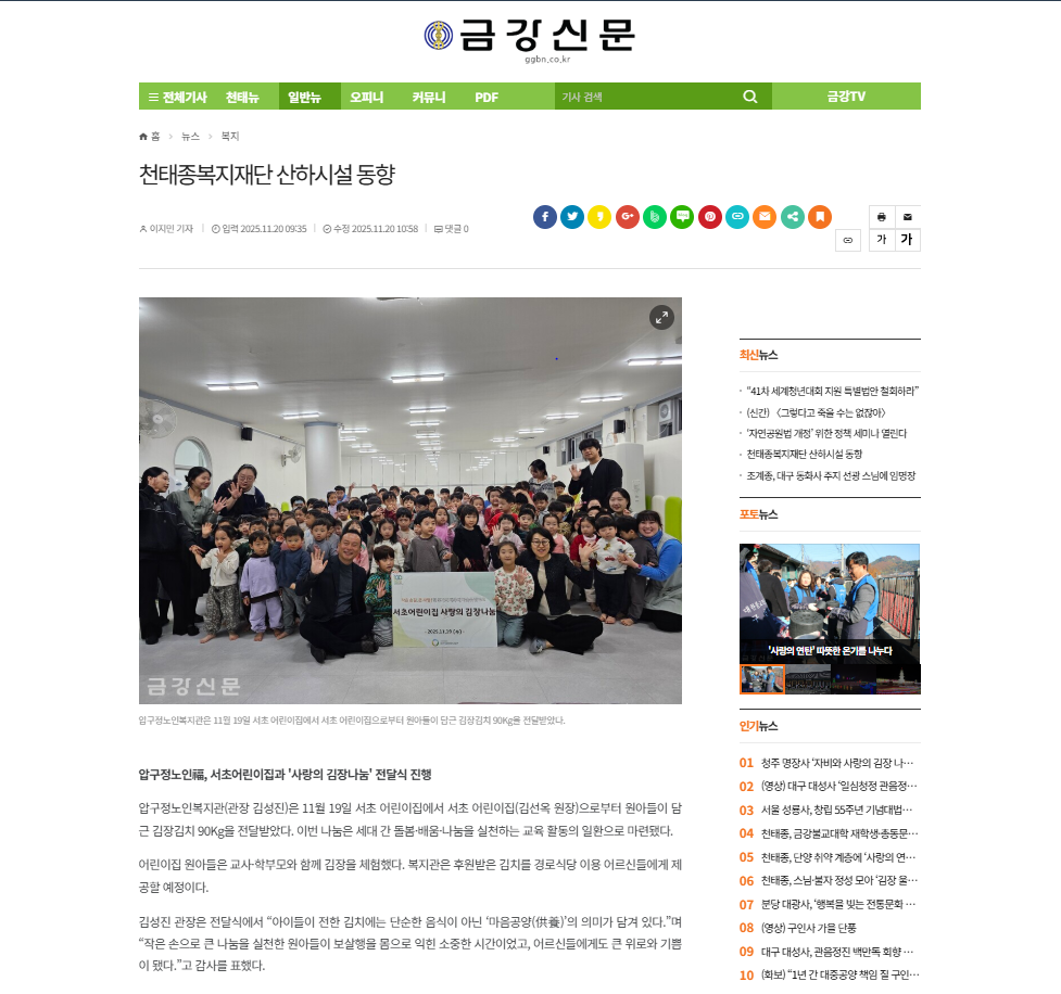 [금강신문] 압구정노인福, 서초어린이집과 사랑의 김장나눔 전달식 진행