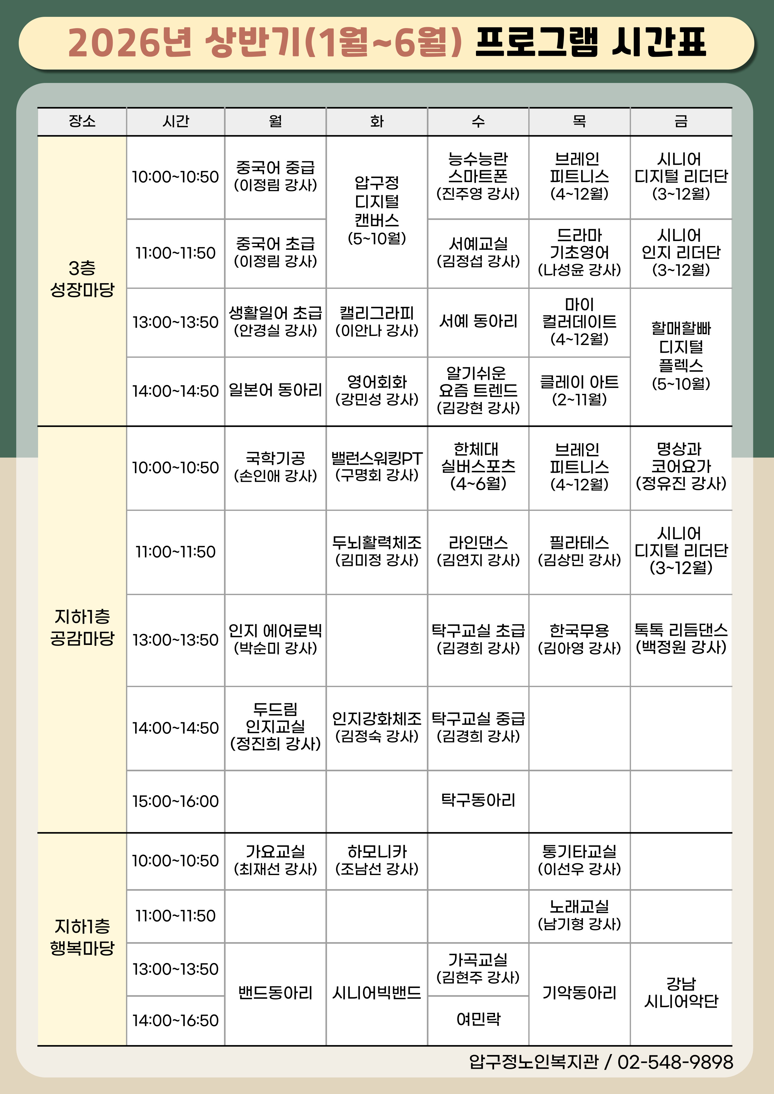 | 가요교실 | 대중가요 및 트로트 신곡을 바탕으로 노래 부르는 방법 습득 |