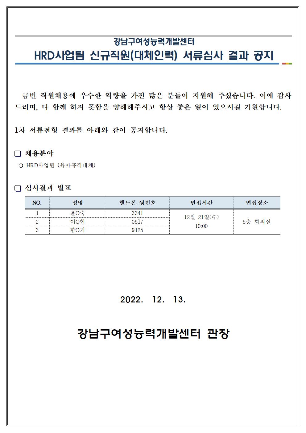 HRD사업팀(대체인력) 1차 서류합격자 발표