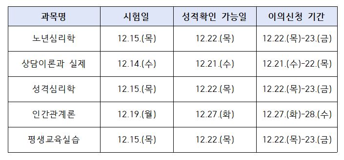 아래의 일정으로 각 과목별 성적확인 및 이의신청이 가능하오니 참고하시기 바랍니다.