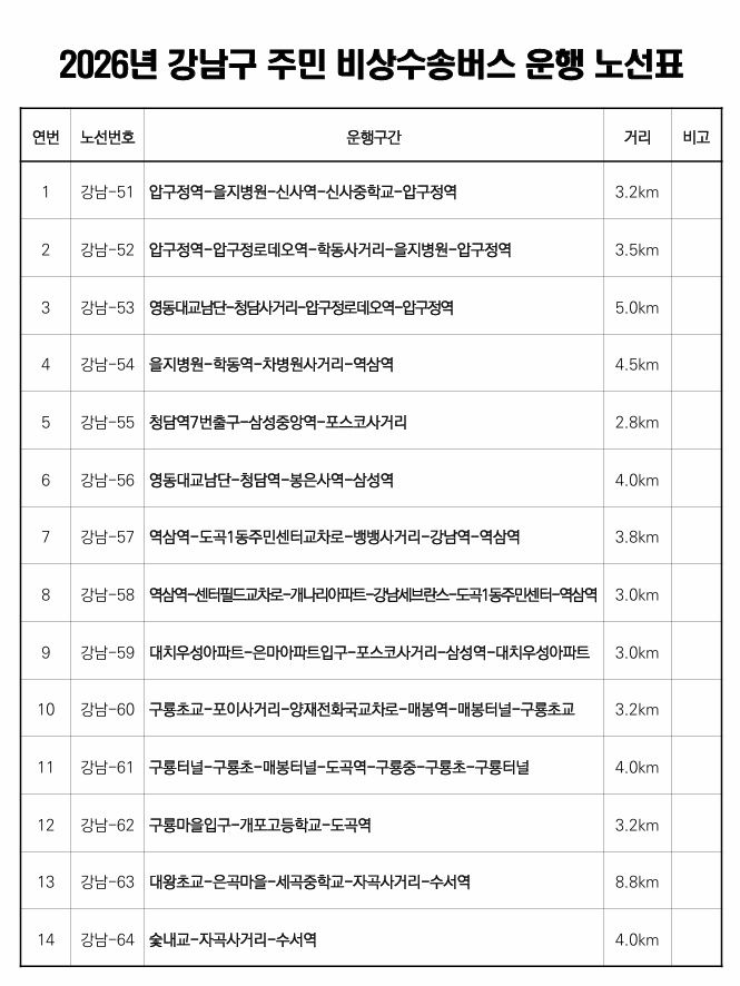 강남구에서 주민 여러분의 이동 불편 최소화를 위한 '비상 수송 버스'를 운행합니다.