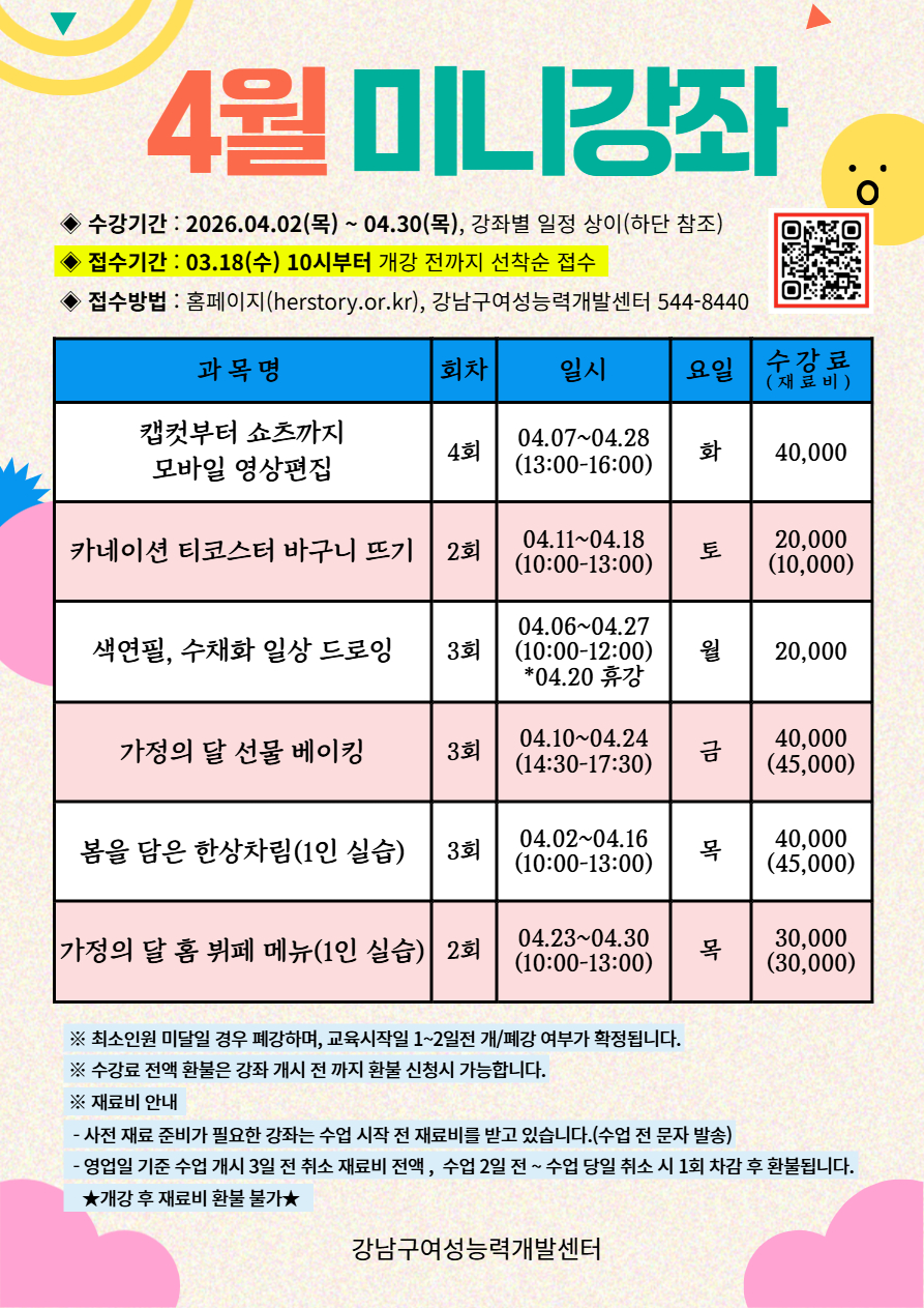 ‣수강기간 : 2026.04.02(목)~04.30(목), 강좌별 일정 상이(이미지 참조)