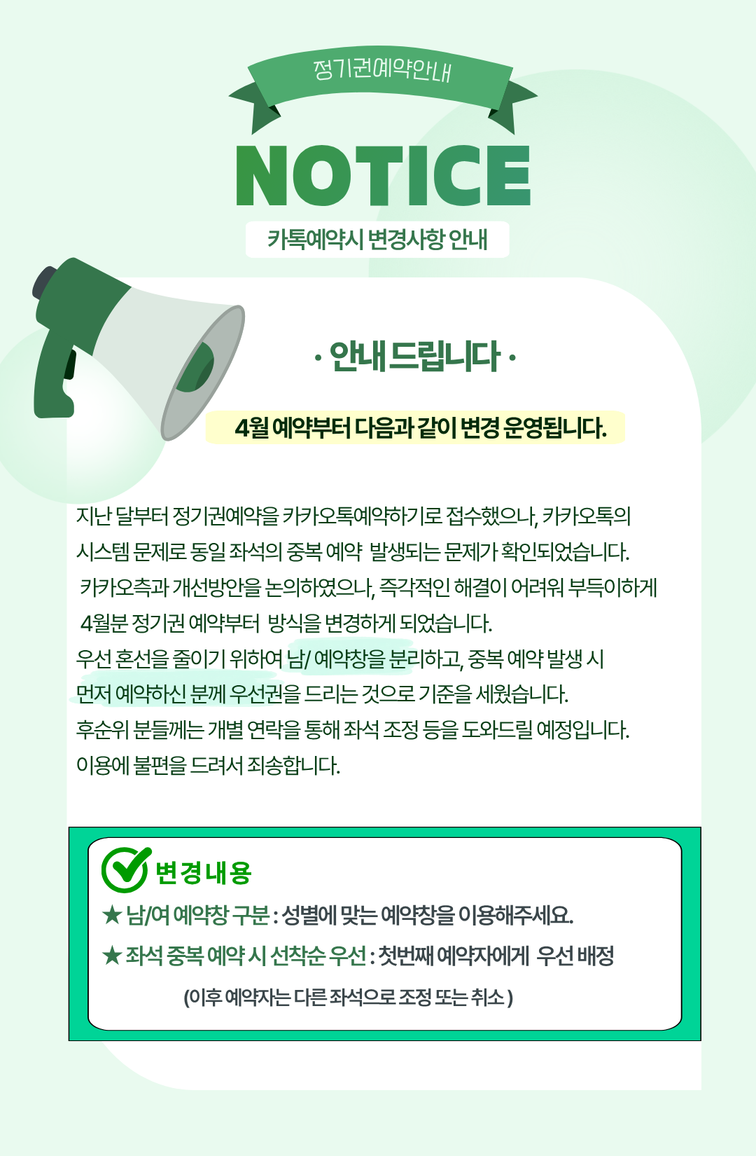 정기권 신청(카톡 예약 남녀 구분 / 동일좌석 선예약자 우선권 부여)