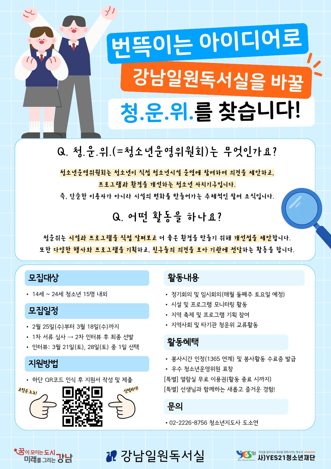 강남일원독서실에서 2026년 청소년운영위원 '청사드레' 신규 위원을 모집합니다.