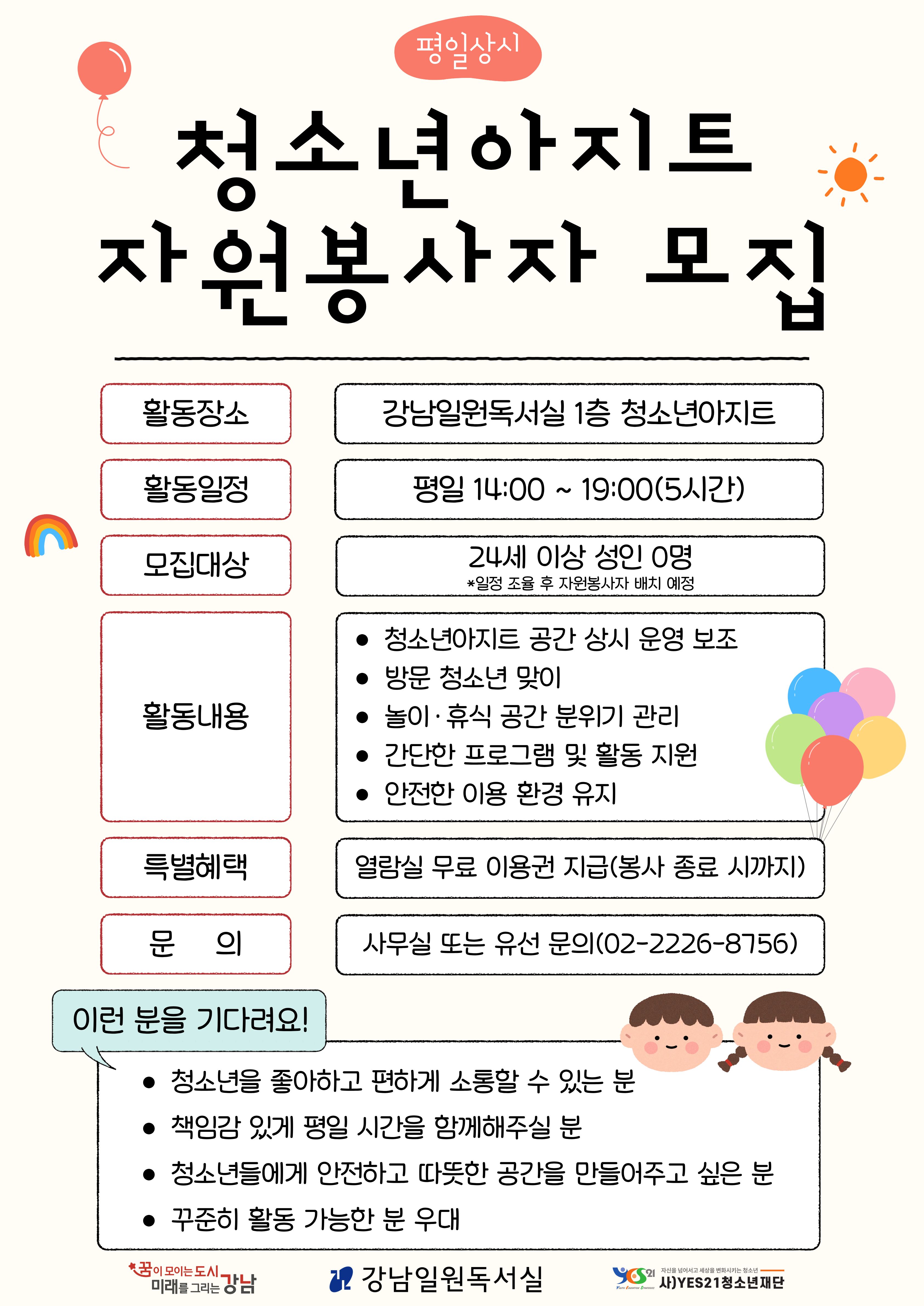 강남일원독서실 1층 청소년아지트에서 방문 청소년을 반갑게 맞이하고, 편안하게 머물 수 있는 공간을 함께 운영해주실 분들의 많은 관심 부탁드립니다. 📞문의: 02-2226-8756 청소년지도사 도소연