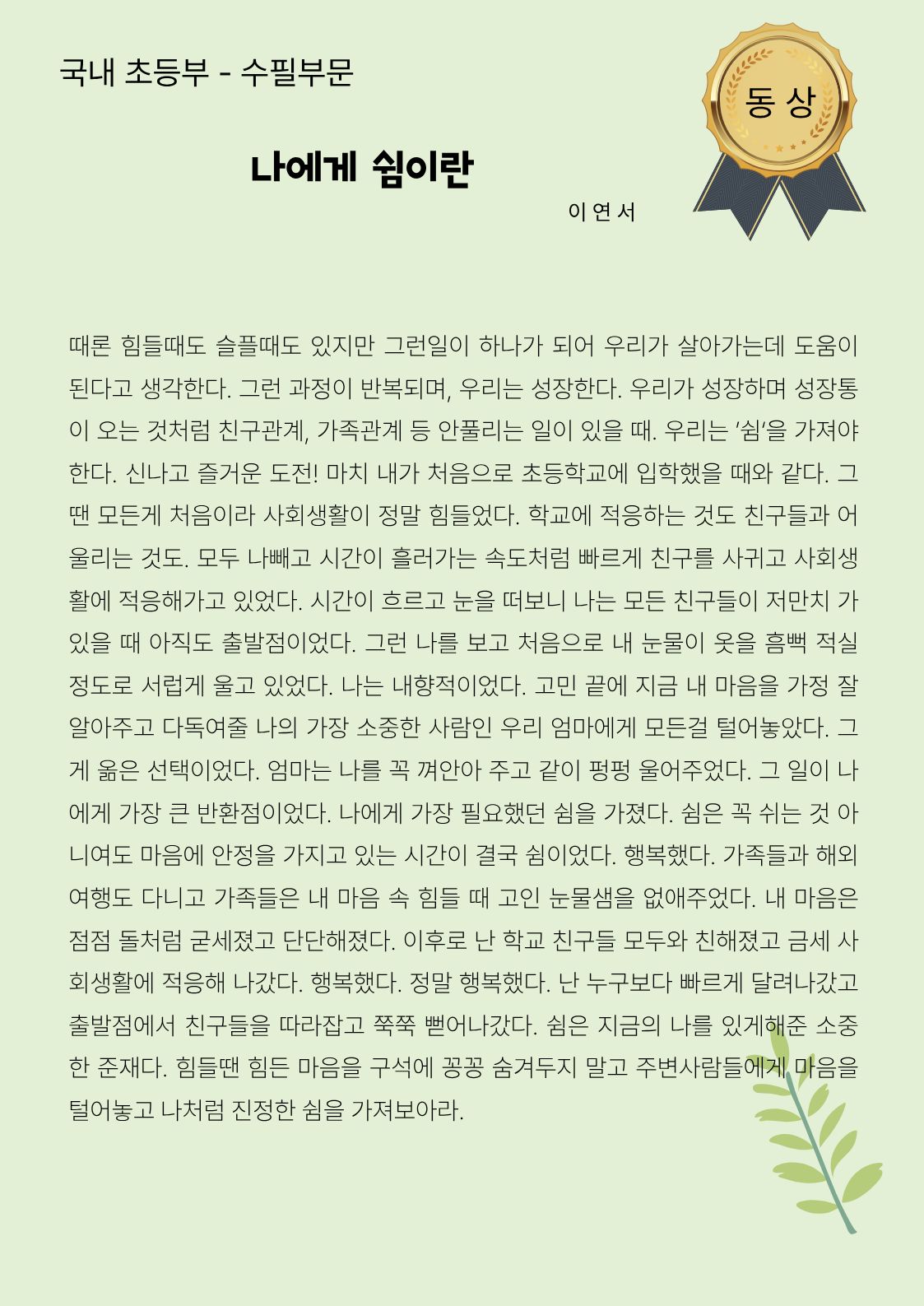 국내 초등부 수필부문 동상