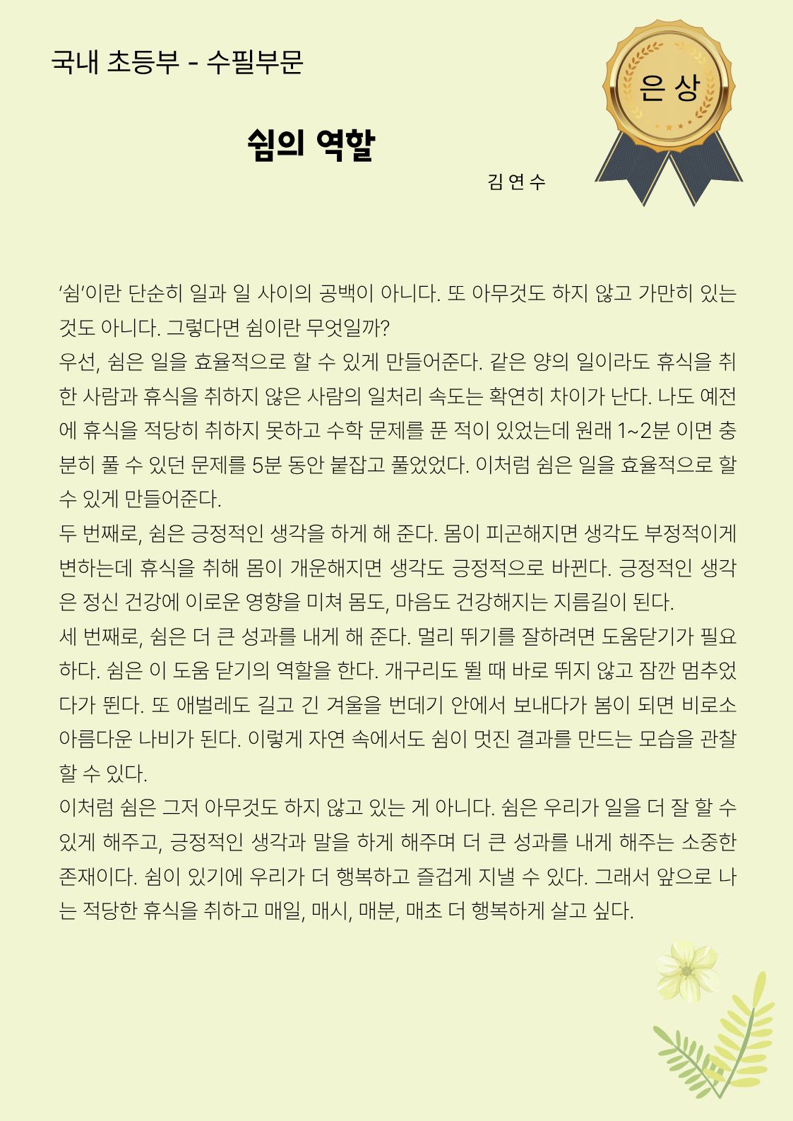 국내 초등부 수필부문 은상