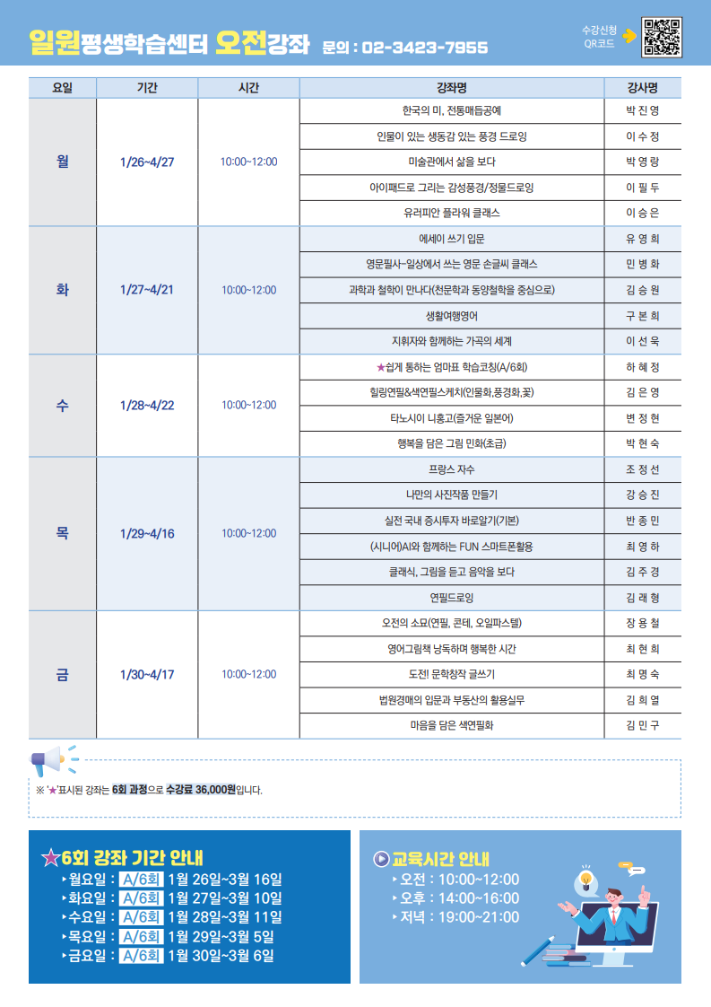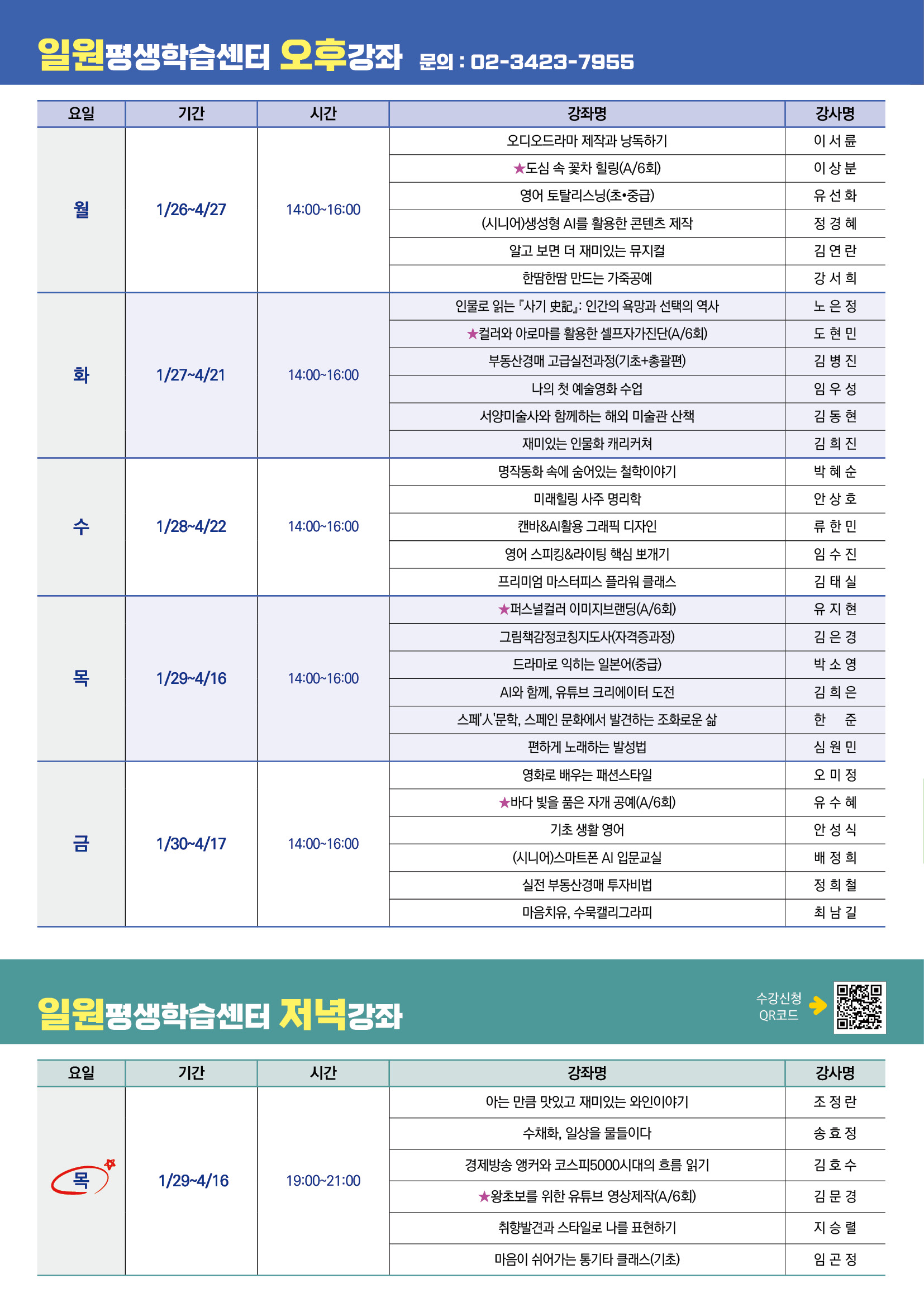 ○ 신청기간 : 2026. 1. 6.(화) 10:00 ~ 1. 20.(화) 17:00 ※강좌별 선착순 마감
