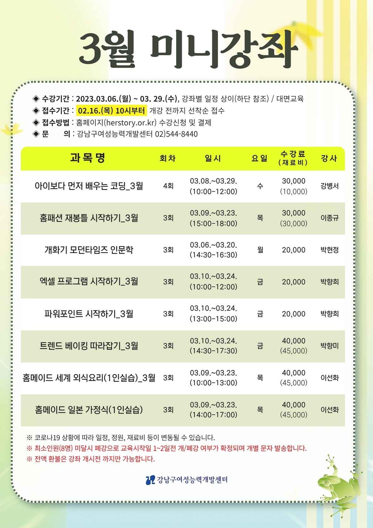 ※ 최소인원(8명) 미달시 폐강이며, 환불은 개강 전날까지만 가능합니다.
