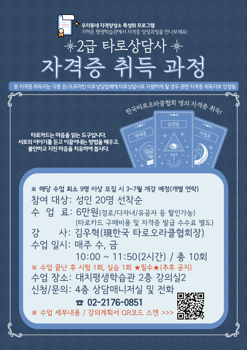 ▶ 강좌명: 2급 타로상담사 자격증 취득과정▶ 접수: 강남구통합예약사이트/로그인필수(https://url.kr/3uog56) 및 대치평생학습관 4층 상담매니저실
